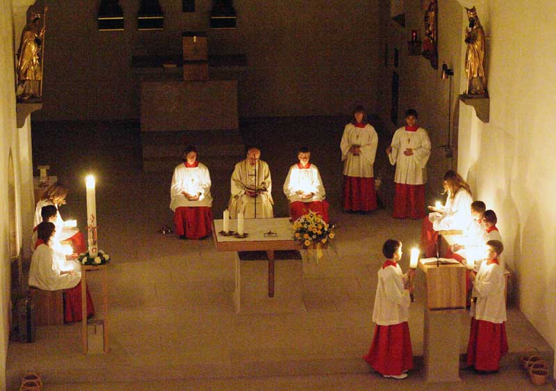 Der Wortgottesdienst beginnt in der Dunkelheit der Nacht, nur durch Kerzen wird der Kirchenraum erleuchtet.