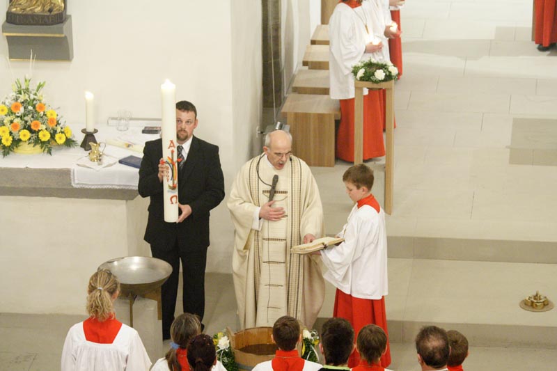 Die “Nacht der Nächte” beginnt vor der Kirche, mit der Segnung des Osterfeuers. An diesem wird die Osterkerze entzündet.